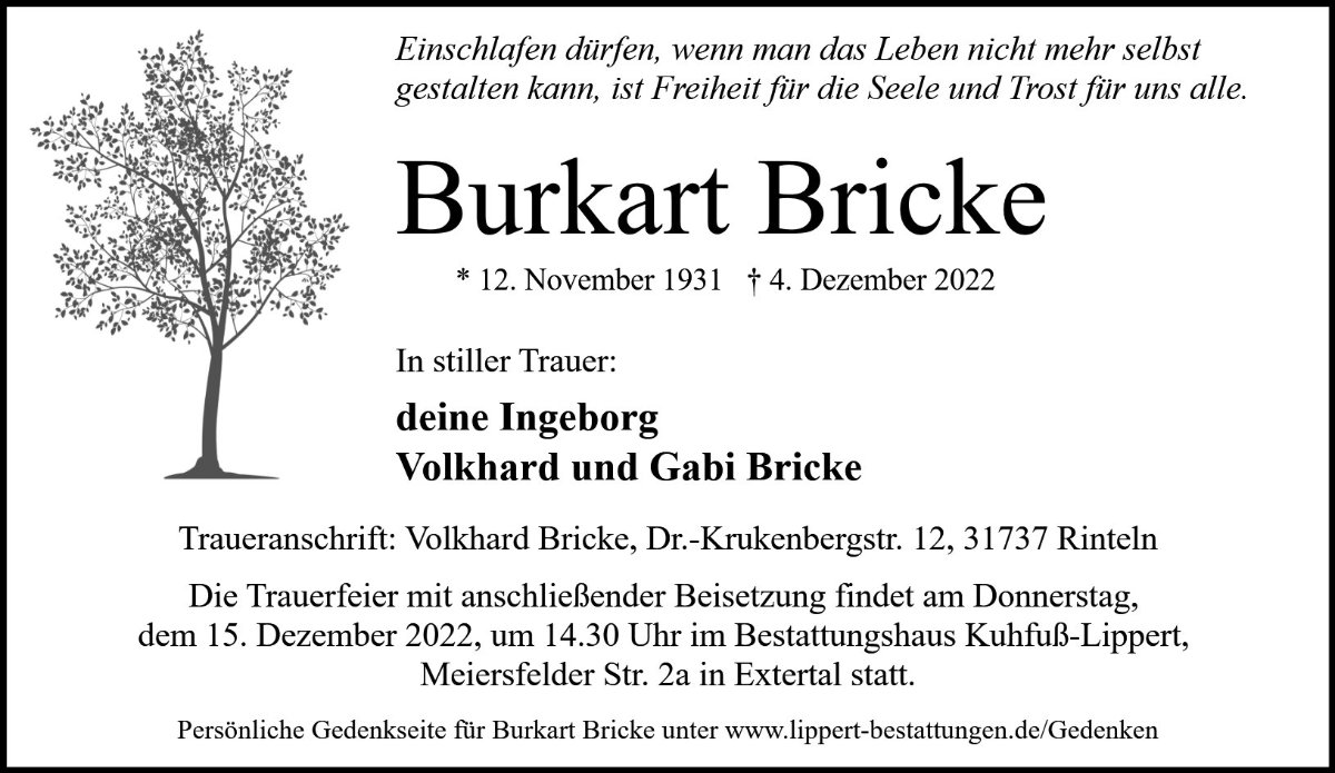wir haben durch die Traueranzeige in der Lippischen Landes-Zeitung erfahren, dass Dein lieber Burkart